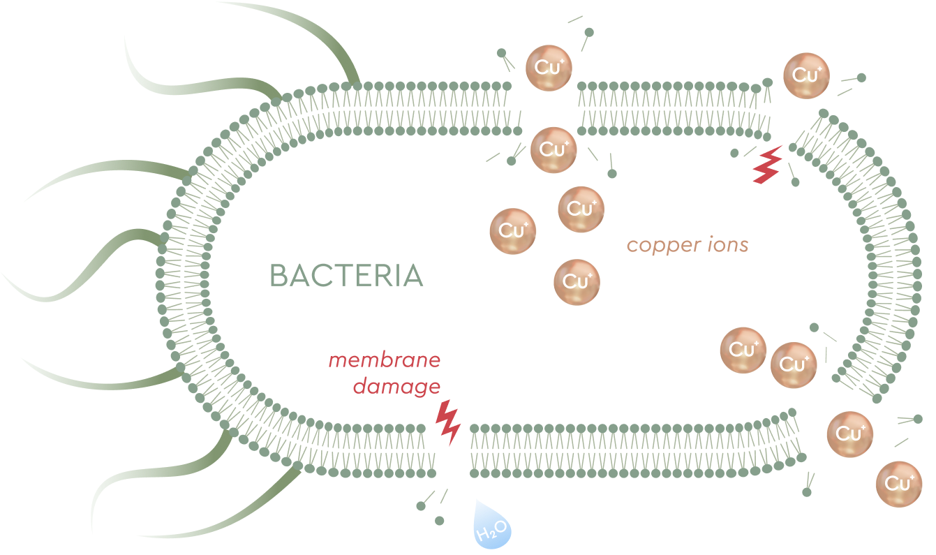 Os íons de cobre destroem a parede externa das bactérias, fazendo com que elas morram.